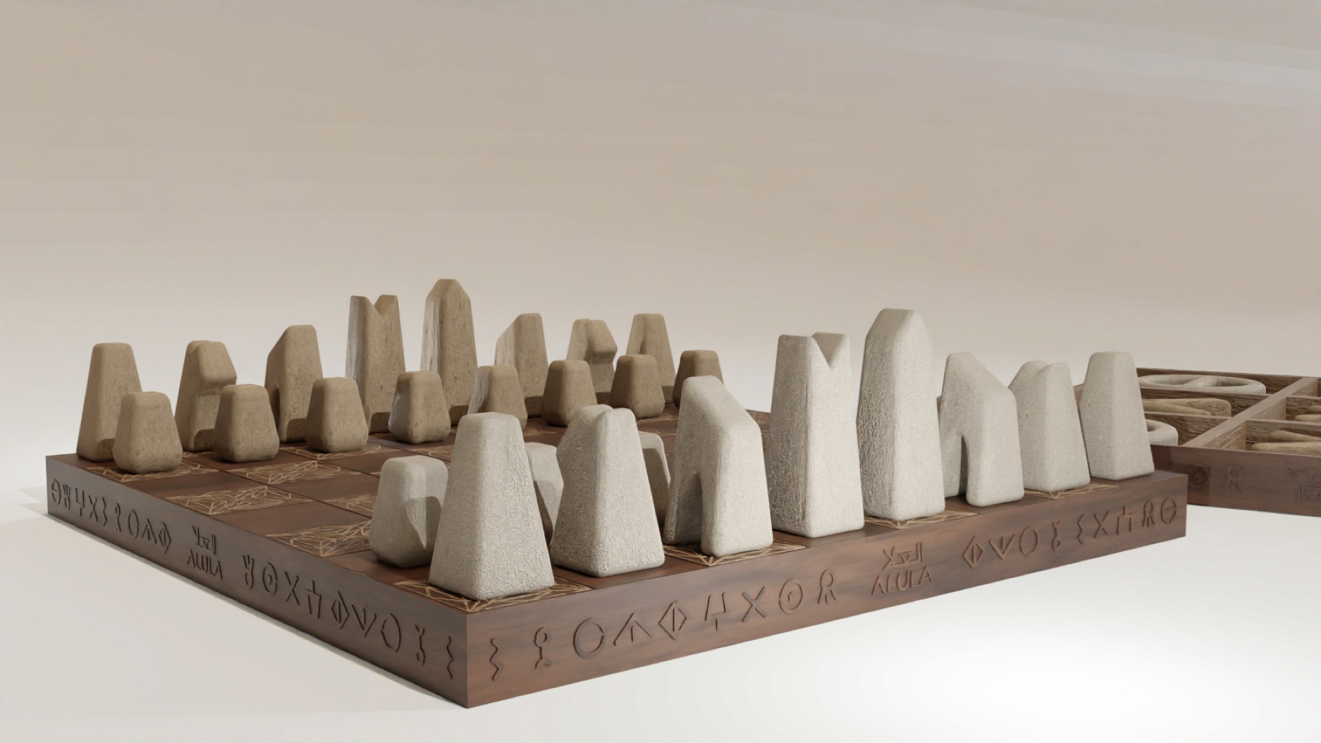 Using locally sourced materials for the chess pieces reinforces the idea of honoring AlUla's cultural heritage and its connection to the land. The primary material chosen for the board is walnut wood and textured sand paint for play pieces, which adds a touch of warmth and elegance to the design while conveying a sense of luxury and sophistication.